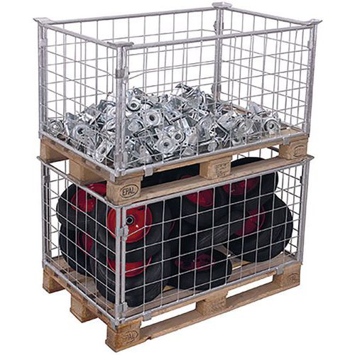 A zárt hálós kialakítású összecsukható raklapbővítők alkalmasak áruk euro raklapokon történő szállítására és tárolására. Maximálisan kihasználják a raklap tárolóhelyét. Szembőség: 100 x 100 mm. A kialakítás nagy teherbírást és négy darab könnyű egymásra rakását garantálja.