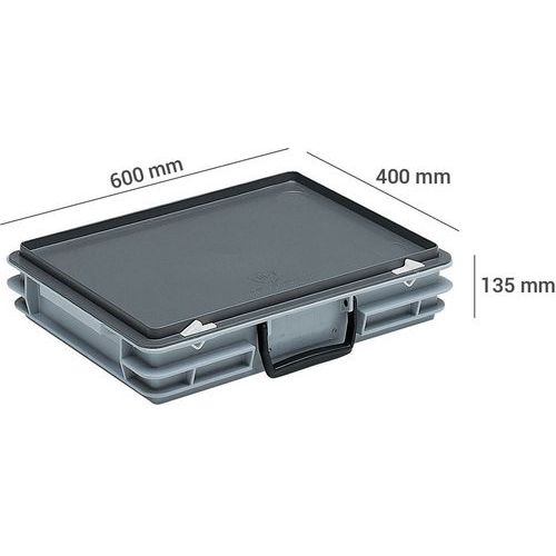 Szállítótáska fedéllel és két csuklópánt-erősítéssel. 2 x reteszzár. Csúszásveszély nélkül egymásra rakható. Sima felület a könnyű tisztítás érdekében. Címkezsebek az egyik hosszú és egy rövid oldalon. Műanyag tok fogantyúval az egyik hosszú oldalon .