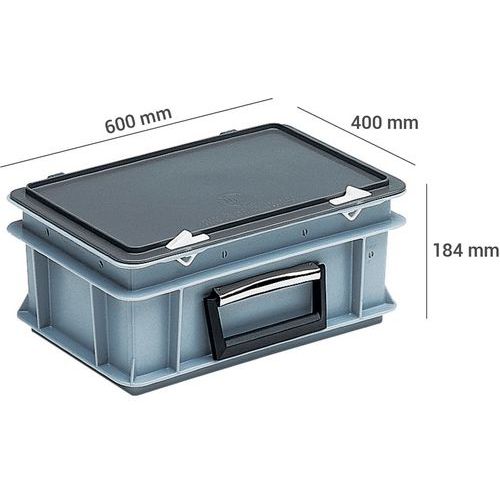 Szállítótáska fedéllel és két csuklópánt-erősítéssel. 2 x reteszzár. Csúszásveszély nélkül egymásra rakható. Sima felület a könnyű tisztítás érdekében. Címkezsebek az egyik hosszú és egy rövid oldalon. Műanyag tok fogantyúval az egyik hosszú oldalon .