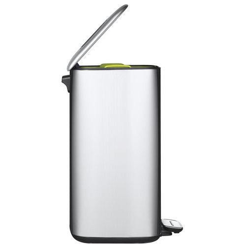 négyzet alakú lépcsős kuka csiszolt rozsdamentes acélból, ujjlenyomatmentes kivitelben. A szemetes műanyag béléssel, hátul fogantyúval és csendes záródású, egyedi kialakítású fedéllel rendelkezik.