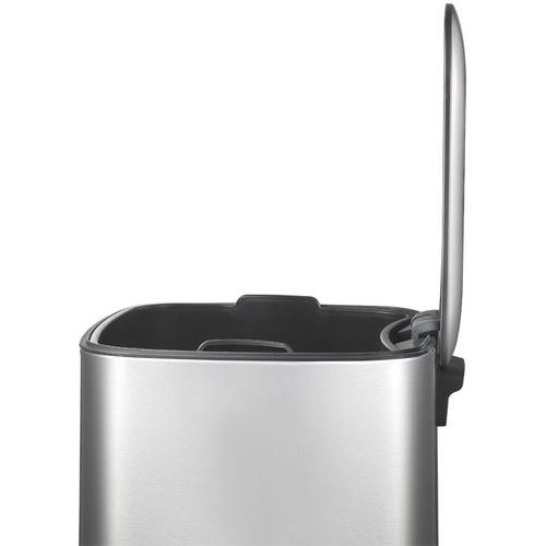 négyzet alakú lépcsős kuka csiszolt rozsdamentes acélból, ujjlenyomatmentes kivitelben. A szemetes műanyag béléssel, hátul fogantyúval és csendes záródású, egyedi kialakítású fedéllel rendelkezik.