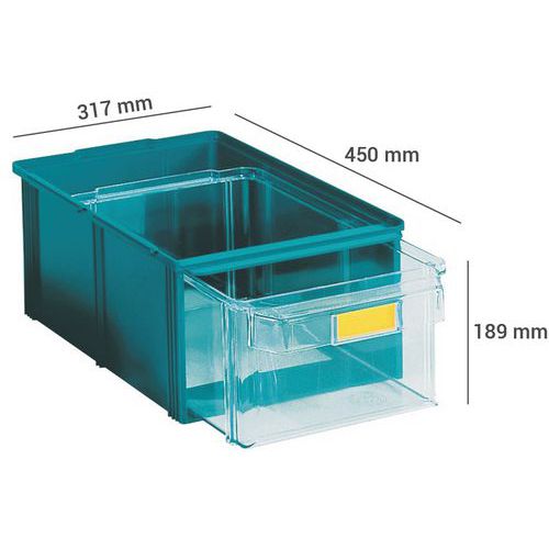 Műanyag dobozok, amelyek egymásra rakhatók dobozokká, vagy csak állva hagyhatók. Az átlátszó műanyagból készült belső kihúzható rész lehetővé teszi a doboz tartalmának gyors ellenőrzését. Az oldalfalak rögzítési rendszerrel csatlakoztathatók. Felső része fedéllel zárható. Gyártói garancia az ügyfélnek : 3 év
