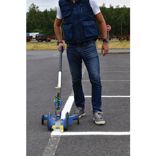 Alkalmas beltéri és kültéri használatra parkolóhelyek kialakítására, valamint gyártási, raktározási, biztonsági területek és gyalogos sétányok megjelölésére. Az applikátor egyenes, tiszta, tiszta és rendkívül tartós vonalakat hoz létre a szabadalmaztatott légáramlási rendszernek köszönhetően, amely megakadályozza, hogy a festék a vonal szélein túlra kivérezzen. Jelölőgép különféle felületekre, beleértve a cementet, epoxit, kátrányt, makadámot, aszfaltot és egyéb útfelületeket. Válasszon bármilyen vonalszélességet 50 és 100 mm között. Az állítható hátsó kerekek lehetővé teszik a falak, élek és ívelt élek közelében lévő vonalak megjelölését.