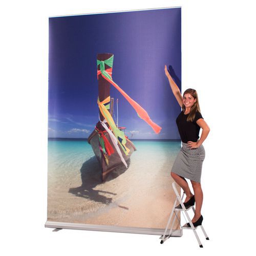 A széles formátumú Roll-Banner Extreme biztosítja az üzenet maximális láthatóságát. A robusztus konstrukció biztonságos használatot tesz lehetővé nagyobb formátumok esetén is. A gyors összeszerelés és az egyszerű szállítás időt takarít meg. Ideális stand hátfalaként vásárokon és rendezvényeken.