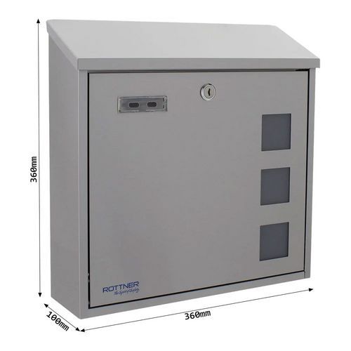 Postaláda áttetsző ablakokkal a tartalom gyors áttekintéséhez. Felső bedobónyílással A4-es méretig. Névtáblatartóval. Hengerzárral zárható elülső ajtóval. Időjárásálló, így beltérben és kültéren egyaránt elhelyezhető. Hátoldali furatokkal a falra történő rögzítéshez.