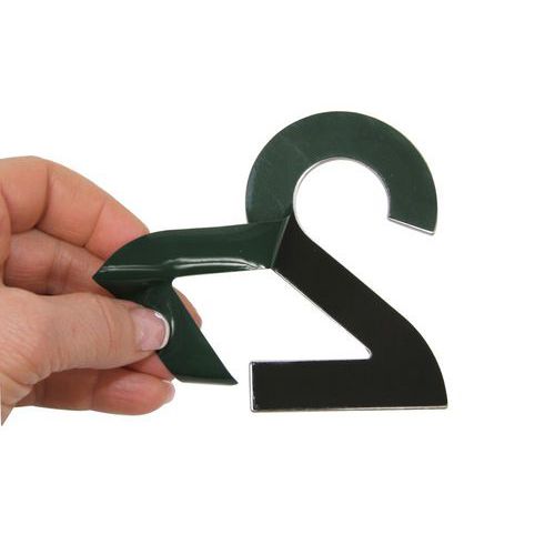 Rozsdamentes acél szám „2D” kivitelben. Ragasztással szerelhető, kétoldali ragasztószalag segítségével. Alkalmas közepesen durva és sima felületre.