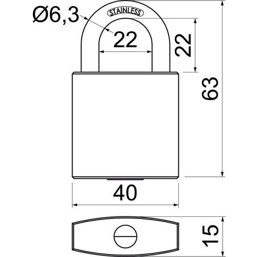 Rozsdamentes lakat finoman szálcsiszolt felülettel, bilincs átmérője 6 mm, magassága 22 mm Rozsdamentes lakat finoman szálcsiszolt felülettel, bilincs átmérője 6 mm, magassága 22 mm