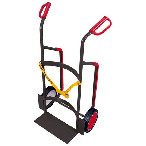 Acéldob 120 - 220 l térfogatú műanyag hordók szállítására. A hordó rögzítésére textilpántokat használnak. Lapát méretei 470 x 160 mm. 2 műanyag fogantyú védelemmel. A műanyag védelemmel ellátott csúszótalpak lehetővé teszik a hordó vízszintes helyzetbe helyezését. Gumiabroncsok acélfelnire vagy tömörgumi kerekek speciális műanyag felnire, precíziós golyóscsapágyakkal és műanyag kerékburkolattal. Keret felületkezelés porfestékkel RAL skála szerint. Teherbírás (kg) : 250 kg
