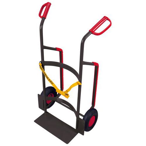 Acéldob 120 - 220 l térfogatú műanyag hordók szállítására. A hordó rögzítésére textilpántokat használnak. Lapát méretei 470 x 160 mm. 2 műanyag fogantyú védelemmel. A műanyag védelemmel ellátott csúszótalpak lehetővé teszik a hordó vízszintes helyzetbe helyezését. Gumiabroncsok acélfelnire vagy tömörgumi kerekek speciális műanyag felnire, precíziós golyóscsapágyakkal és műanyag kerékburkolattal. Keret felületkezelés porfestékkel RAL skála szerint. Teherbírás (kg) : 250 kg
