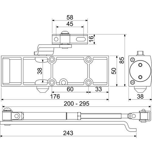 Ajtózáró beltéri ajtókhoz, rögzítőkarral. Záróerő 3 az EN1154 alapján. Állítható zárási és billenési sebesség. Falra vagy ajtókeretre szerelhető.