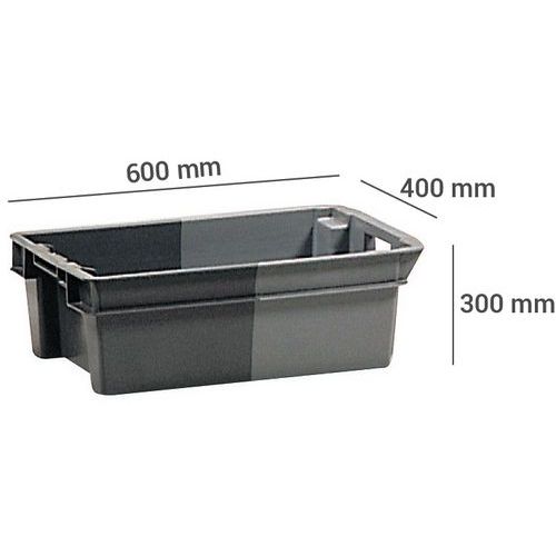 60%-ban visszahúzódik egymásra rakáskor, így tárhelyet takaríthat meg. Könnyű kezelés a nagy fogantyúknak köszönhetően. A sima fenéknek köszönhetően minden típusú szállítószalaggal kompatibilis. A kettős színszerkezet megkönnyíti a halmozási/tárolási pozíciók azonosítását. Max. terhelés (kg) : 30 kg Gyártói garancia az ügyfélnek : 3 év