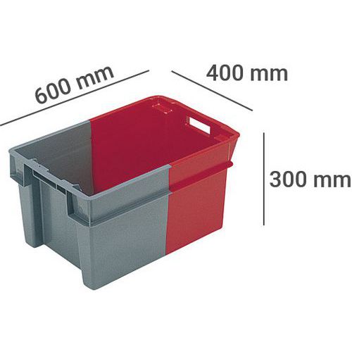 60%-ban visszahúzódik egymásra rakáskor, így tárhelyet takaríthat meg. Könnyű kezelés a nagy fogantyúknak köszönhetően. A sima fenéknek köszönhetően minden típusú szállítószalaggal kompatibilis. A kettős színszerkezet megkönnyíti a halmozási/tárolási pozíciók azonosítását. Gyártói garancia az ügyfélnek : 3 év Max. terhelés (kg) : 30 kg