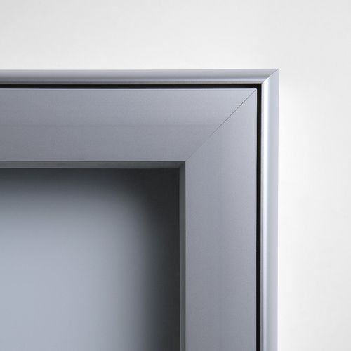 Mágneses vitrinek ezüst eloxált alumínium kerettel, alkalmas beltérbe. A gumitömítéses elülső ajtó biztosítja a vízhatlanságot. 4 mm vastag keményített ESG üveg ESG üveg: Speciális, biztonsági keményített üveg - ajtóüvegként vagy autók szélvédőjeként használják.