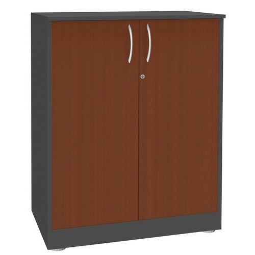 Alacsony irodai szekrény dokumentumok és mappák tárolására. Alapanyaga bútorlap. Két polccal rendelkezik. A szekrény zárható. Alumínium színű fém fogantyú. Állítható lábak a szintezéshez.