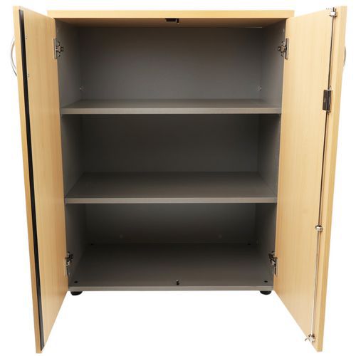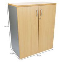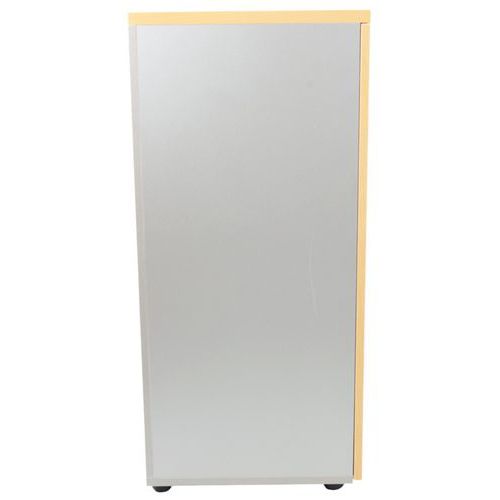 Alacsony irodai szekrény dokumentumok és mappák tárolására. Alapanyaga bútorlap. Két polccal rendelkezik. A szekrény zárható. Alumínium színű fém fogantyú. Állítható lábak a szintezéshez. Gyártói garancia az ügyfélnek : 10 év