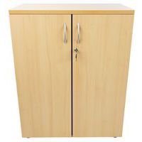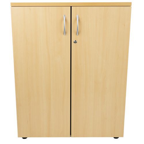 Alacsony irodai szekrény dokumentumok és mappák tárolására. Alapanyaga bútorlap. Két polccal rendelkezik. A szekrény zárható. Alumínium színű fém fogantyú. Állítható lábak a szintezéshez.