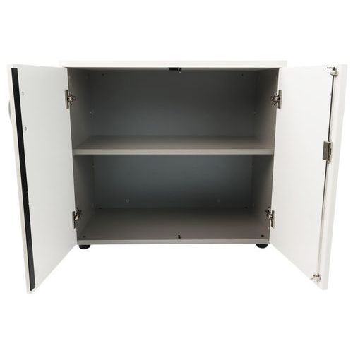 Alacsony irodai szekrény dokumentumok és mappák tárolására. Bútorlapokból készül. Egy polccal rendelkezik. A szekrény zárható. Alumínium színű fém fogantyú. Állítható lábak a szintezéshez. Gyártói garancia az ügyfélnek : 10 év