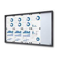 Az elegáns vitrin karcsú tolóajtókkal tiszta és áttekinthető megjelenítést biztosít. Az üveg biztonsági ajtó és az acél hátlap professzionális benyomást kelt. Íráshoz és mágnesekhez alkalmas felület, rugalmas használatot biztosít. Ideális iskolákba, tárgyalókba és nyilvános helyiségekbe.