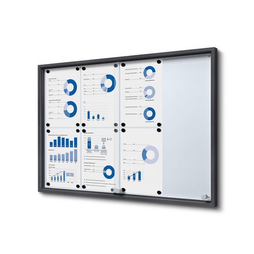 Az elegáns vitrin karcsú tolóajtókkal tiszta és áttekinthető megjelenítést biztosít. Az üveg biztonsági ajtó és az acél hátlap professzionális benyomást kelt. Íráshoz és mágnesekhez alkalmas felület, rugalmas használatot biztosít. Ideális iskolákba, tárgyalókba és nyilvános helyiségekbe.