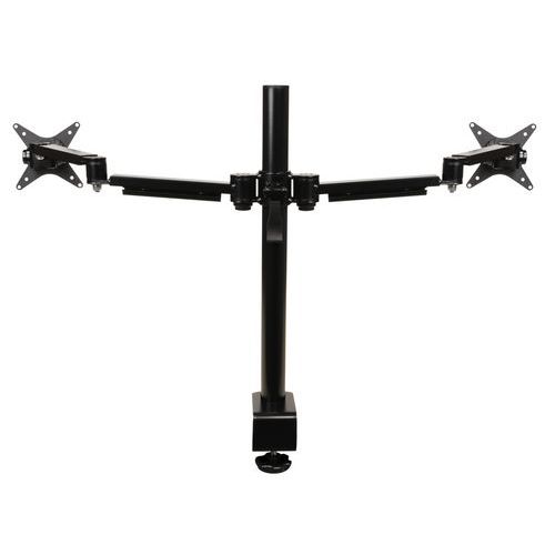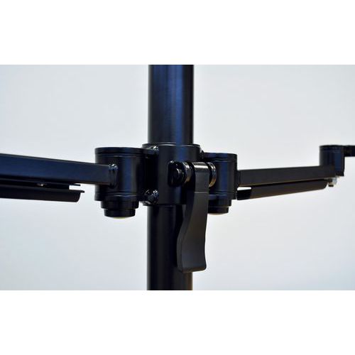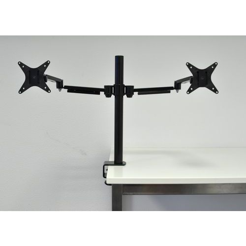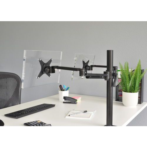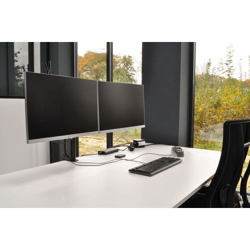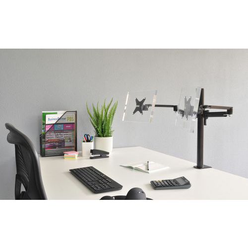 Rugalmas, összecsukható tartókar karcsú, elegáns kialakítással két monitorhoz.