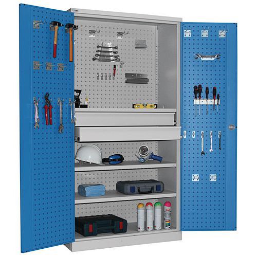 Hegesztett műhelyszekrény teljesen kihúzható fiókokkal és perforált hátlappal szerszámtartókhoz. Az ajtók és a hátlap perforált szerszámtartó kampókkal kompatibilis kialakítással (10 x 10 mm-es négyzetes furatok, 38 mm-es osztással). Zárás kétpontos hengerzárral. A szekrény szerelőfuratokkal talajhoz és falhoz is rögzíthető.