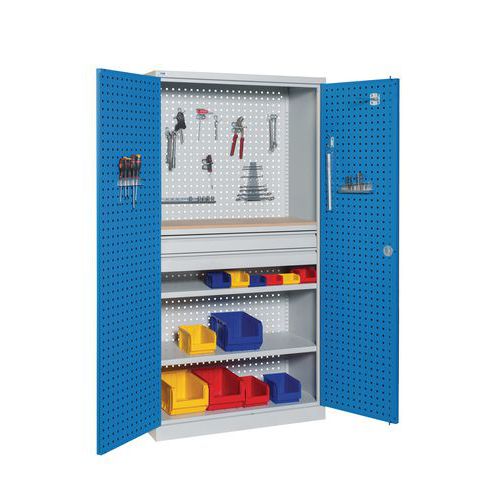 Hegesztett műhelyszekrény teljesen kihúzható fiókokkal és perforált hátlappal szerszámtartókhoz. Az ajtók és a hátlap perforált szerszámtartó kampókkal kompatibilis kialakítással (10 x 10 mm-es négyzetes furatok, 38 mm-es osztással). Zárás kétpontos hengerzárral. A szekrény szerelőfuratokkal talajhoz és falhoz is rögzíthető.