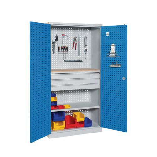 Hegesztett műhelyszekrény teljesen kihúzható fiókokkal és perforált hátlappal szerszámtartókhoz. Az ajtók és a hátlap perforált szerszámtartó kampókkal kompatibilis kialakítással (10 x 10 mm-es négyzetes furatok, 38 mm-es osztással). Zárás kétpontos hengerzárral. A szekrény szerelőfuratokkal talajhoz és falhoz is rögzíthető.