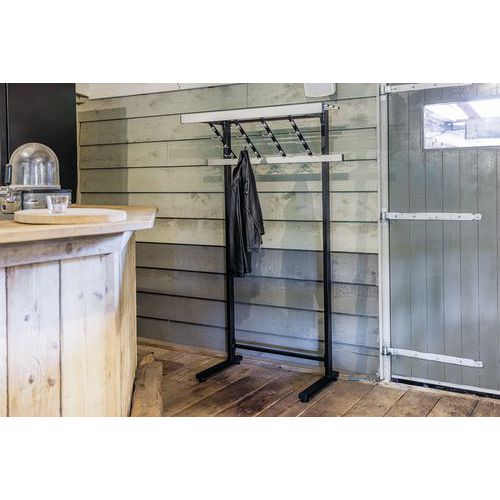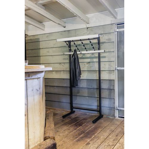 Akasztósín kalaptartóval, ferde fogantyúkkal és dupla akasztókkal. Egyszerű kabáttartó – tökéletes a vendégek kabátjainak tárolására. Kabát és kabáttartó.