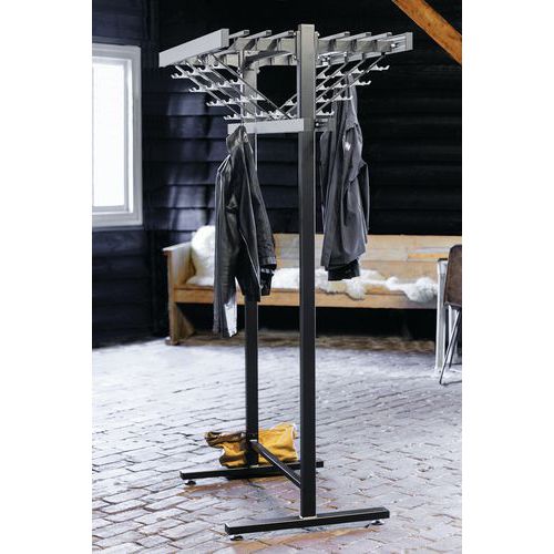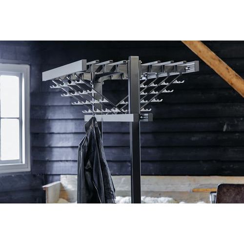 Akasztósín kalaptartóval, ferde fogantyúkkal és dupla akasztókkal. Egyszerű kabáttartó – tökéletes a vendégek kabátjainak tárolására. Kabát és kabáttartó.