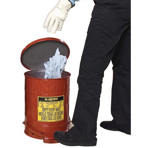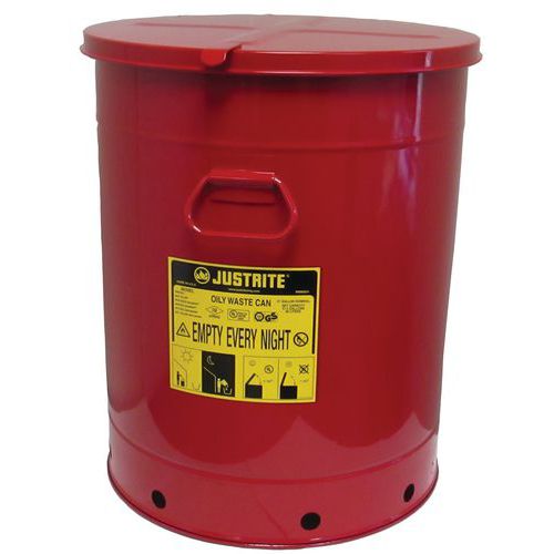Olajjal átitatott rongyok ártalmatlanítására használható a szikrák és öngyulladás okozta tüzek megelőzése érdekében. A fedél használaton kívül zárva marad, hogy a tartalmat elszigetelje a tűzforrásoktól és korlátozza az oxigén beáramlását. A tartós porszórt acélszerkezet jó kémiai ellenállást biztosít. Felfordítható hordozófogantyúval. A kerek konstrukció és a megemelt talp lehetővé teszi, hogy a levegő keringjen a tartály körül a hő eloszlatása, valamint a nedvesség felhalmozódásának és a korróziónak a csökkentése érdekében. Figyelmeztető címke piktogramokkal a kommunikációs problémák csökkentése érdekében.