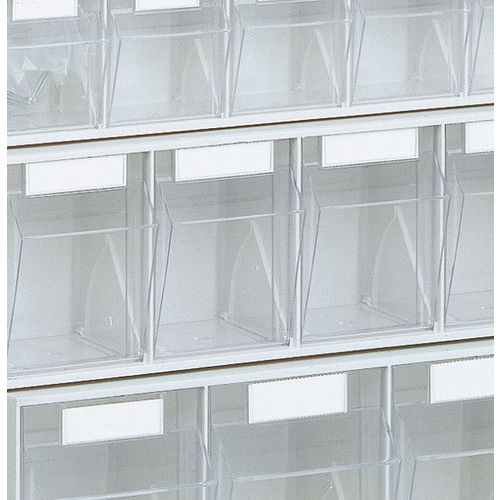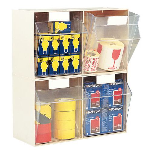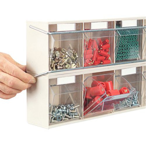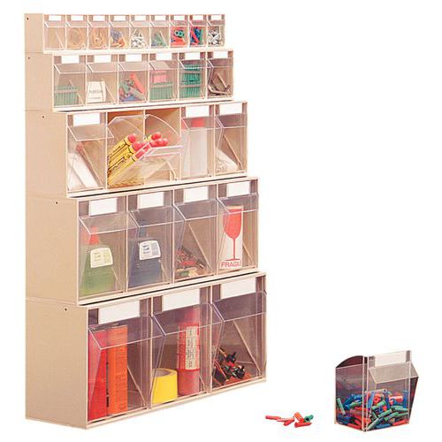 Tárolja gondosan dolgait a dobozok dönthető polcrendszerével. A csuklós kosarak egyszerű eltávolítása a tartóból. A különböző billenő tartályok nagyon erősek és ellenállnak az olajoknak és üzemanyagoknak. Foglincsekkel és címketartókkal felszerelt kosarak. Egyszerűen helyezzen egymásra 6 műanyag modellt, vagy akassza fel őket.