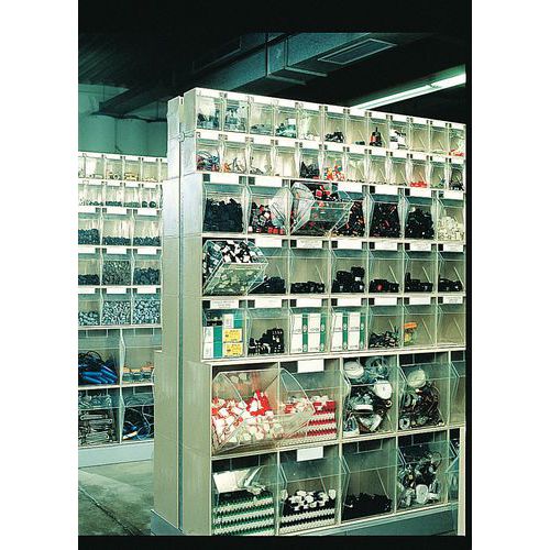 Tárolja gondosan dolgait a dobozok dönthető polcrendszerével. A csuklós kosarak egyszerű eltávolítása a tartóból. A különböző billenő tartályok nagyon erősek és ellenállnak az olajoknak és üzemanyagoknak. Foglincsekkel és címketartókkal felszerelt kosarak. Egyszerűen helyezzen egymásra 6 műanyag modellt, vagy akassza fel őket. Gyártói garancia az ügyfélnek : 3 év Max. terhelés (kg) : 50
