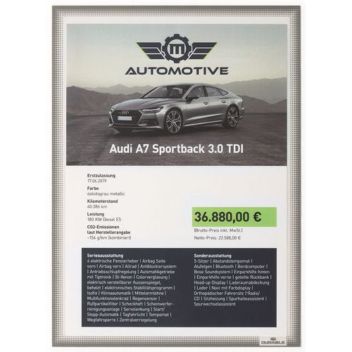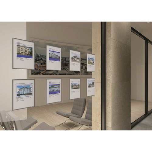 Statikus információs zsebek ragasztó nélküli összeszereléshez. Mindenféle üvegfelületre és a legtöbb akril és PVC felületre rögzíthetők beltérben. Hőálló körülbelül 70 °C-ig. UV-állóság akár 2 évig. Szükség szerint eltávolítható és áthelyezhető. A4-es formátum, ajánlatok, árak és egyéb információk bemutatására. Használható álló vagy fekvő tájolásban.