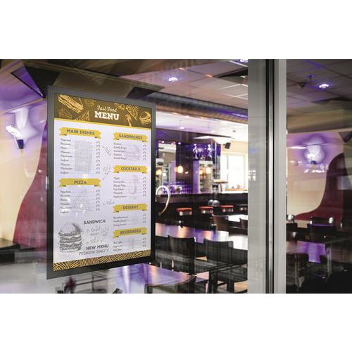 Információs dobozok dokumentumok, például árak, nyitvatartási idő, akciók stb. megjelenítéséhez. A Duraframe Sun kereteket kifejezetten napfénynek kitett üvegfelületekhez tervezték. A statikus rögzítésnek köszönhetően a keret vitrinekre, ablakokra, üvegtáblákra stb. rögzíthető. Gyors dokumentumcsere a mágneses keretnek köszönhetően. Hőálló (70 °C-ig). Akár 2 évig tartó UV-kezelés. Tükröződésgátló fóliával. A keret színe mindkét oldalon azonos. Használható álló vagy fekvő tájolásban. Gyártói garancia az ügyfélnek : 2 év