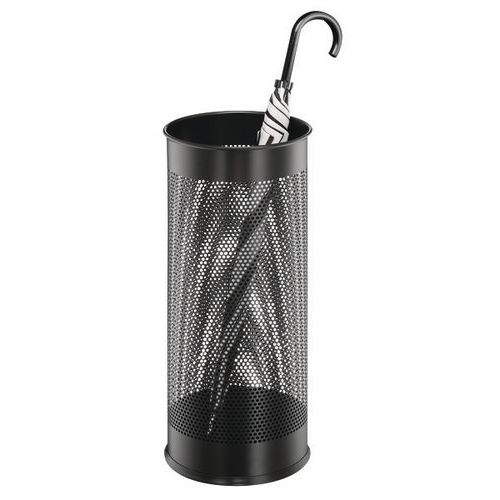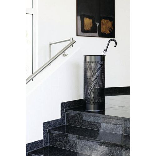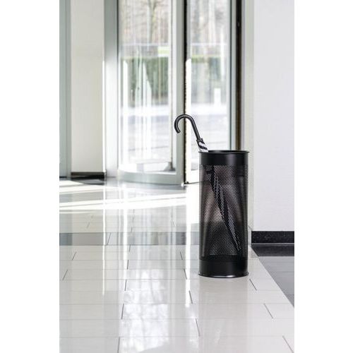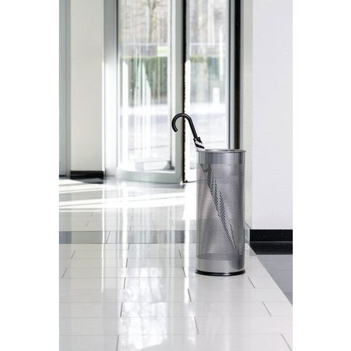Elegáns dizájn esernyőtartó perforált falakkal. Acélból, epoxi bevonattal. Műanyag csík az alján a padló védelmére. Ideális üzletek és irodák bejáratához.