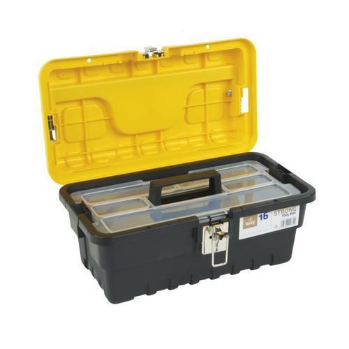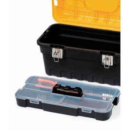 Szerszámos koffer kivehető kisebb szerszámtárolóval, átlátszó fedéllel. Fém gyorszár segítségével zárható. Praktikus lehajtható fogantyú.