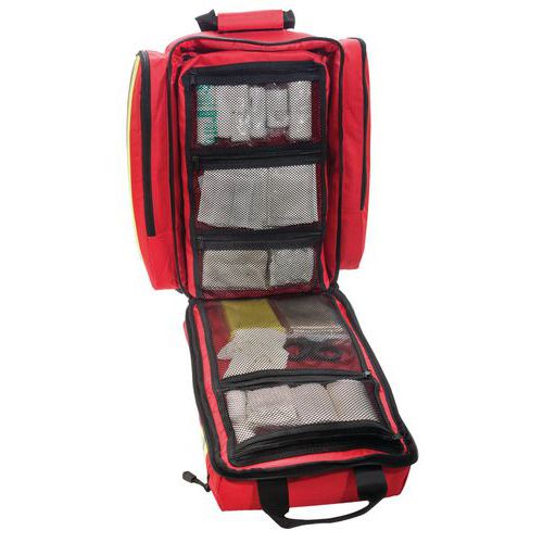 Sürgősségi mentőhátizsák az egészségügyi anyag egyszerű szállítására. Teljesen kihajtható nyitás biztosítja a hátizsák tartalmának gyors áttekintését. A zsák és a zsebek cipzárral zárhatók. A nagyfokú láthatóságot a fényvisszaverő csíkok biztosítják. A párnázott hátrész és a vállpántok állíthatók a kényelmes hordásért. Felső füllel is rendelkezik.