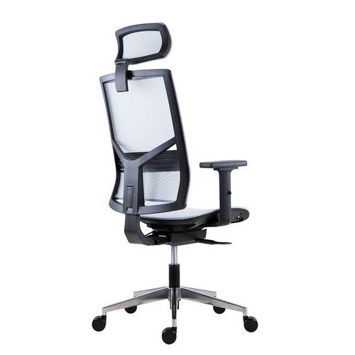Modern Omnia irodai szék szürke kivitelben, önhordó hálószövet borítással a háttámlán és az ülésen egyaránt. A székhez tartozik egy hálós fejtámla, amelynek magassága és dőlésszöge a felhasználó igényei szerint állítható. A háttámla magassága állítható, és a választott pozícióban rögzíthető. Az ülés elülső széle jelentősen lekerekített (az elülső szélén puha poliuretán bélés található). SYN-SL szinkronmechanizmus négyszeres rögzítéssel és automatikus ellensúly-beállítással. Az ülés mélysége az ülő igényei szerint állítható. A szék minőségi alumínium kereszttartón áll, 60 mm átmérőjű kerekekkel puha felületekhez. Teherbírása 150 kg.