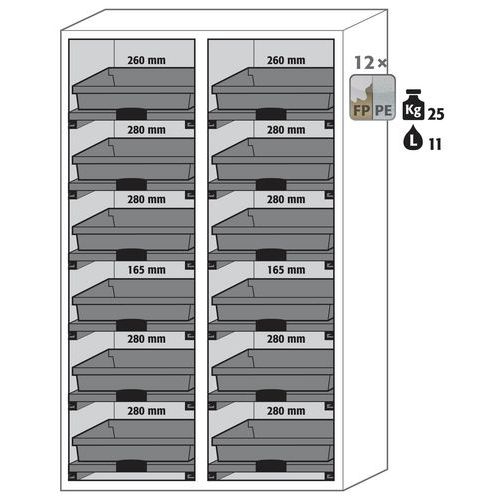 Szekrény maró anyagokra, 1965 x 1197 x 603 mm, PP, 2 rész, 12 kihúzható kármentőpolc, 11 l, fehér Szekrény maró anyagokra, 1965 x 1197 x 603 mm, PP, 2 rész, 12 kihúzható kármentőpolc, 11 l, fehér