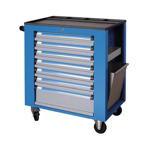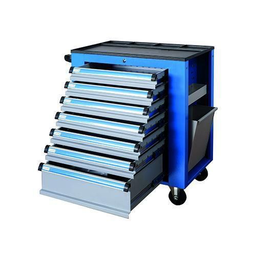 - A zárható fém műhelykocsi görgős síneken futó hét fiókkal van felszerelve, amelyek lehetővé teszik a 100 %-os kihúzhatóságot. A két szabadon futó és két forgó 100 mm átmérőjű görgőn mozgatható kocsi egy felső peremmel ellátott tárolófelülettel és szerszámrekeszekkel rendelkezik. A kocsi része egy felfüggeszthető kosár a tisztító kendők számára, egy állítható papírtekercs tartó, és egy box az apró tárgyak tárolására. Beszerezhetők osztórekeszek.