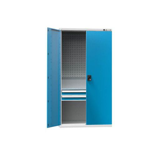 SK szárnyasajtókkal ellátott szekrény 180°-os nyitásszöggel. Stabil acéllemez szerkezet. A polc magassága 25 mm-es lépésekben állítható. Perforált panelek segítségével függeszthető programokat lehet felakasztani, amelyek a szekrény hátuljára vagy oldalfalára, illetve az ajtóba helyezhetők.