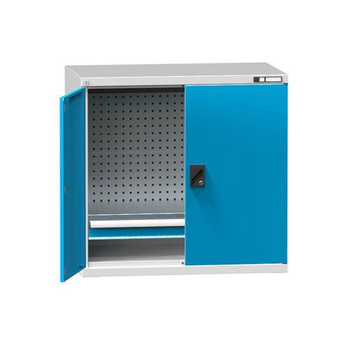SK szárnyasajtókkal ellátott szekrény 180°-os nyitásszöggel. Stabil acéllemez szerkezet. A polc magassága 25 mm-es lépésekben állítható. Perforált panelek segítségével függeszthető programokat lehet felakasztani, amelyek a szekrény hátuljára vagy oldalfalára, illetve az ajtóba helyezhetők.