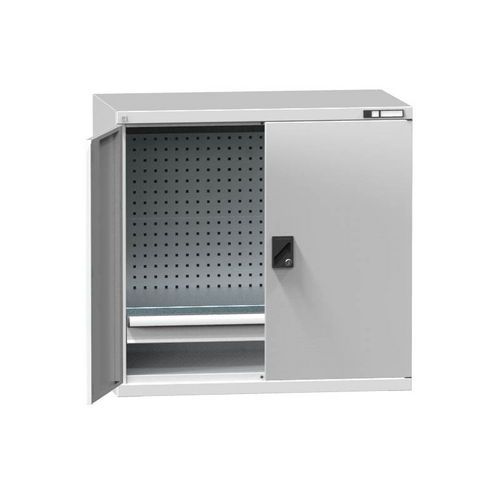 SK szárnyasajtókkal ellátott szekrény 180°-os nyitásszöggel. Stabil acéllemez szerkezet. A polc magassága 25 mm-es lépésekben állítható. Perforált panelek segítségével függeszthető programokat lehet felakasztani, amelyek a szekrény hátuljára vagy oldalfalára, illetve az ajtóba helyezhetők.