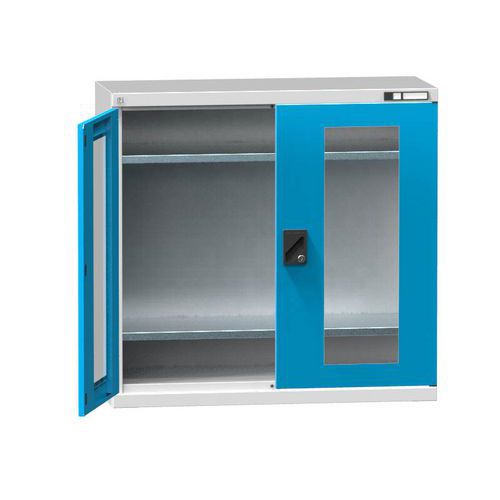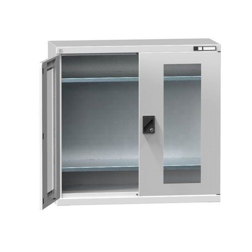 SK szárnyasajtókkal ellátott szekrény 180°-os nyitásszöggel. Stabil acéllemezből készült szerkezet. Az üvegajtók edzett biztonsági üveget használnak. A polc magassága 25 mm-es lépésekben állítható. Perforált panelek segítségével függeszthető program a szekrény hátuljára vagy oldalfalára, illetve az ajtóba is rögzíthető.