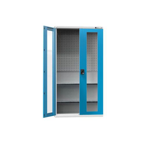 SK szárnyasajtókkal ellátott szekrény 180°-os nyitásszöggel. Stabil acéllemezből készült szerkezet. Az üvegajtók edzett biztonsági üveget használnak. A polc magassága 25 mm-es lépésekben állítható. Perforált panelek segítségével függeszthető programokat lehet elhelyezni a szekrény hátulján vagy oldalfalán, vagy az ajtóban.