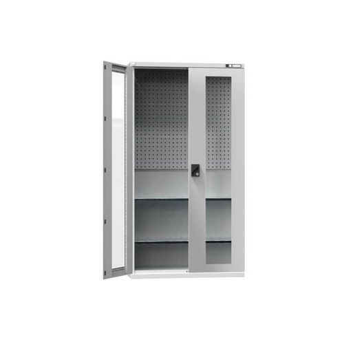 SK szárnyasajtókkal ellátott szekrény 180°-os nyitásszöggel. Stabil acéllemezből készült szerkezet. Az üvegajtók edzett biztonsági üveget használnak. A polc magassága 25 mm-es lépésekben állítható. Perforált panelek segítségével függeszthető programokat lehet elhelyezni a szekrény hátulján vagy oldalfalán, vagy az ajtóban.