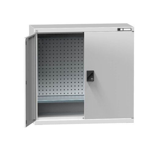 SK szárnyasajtókkal ellátott szekrény 180°-os nyitásszöggel. Stabil acéllemez szerkezet. A polc magassága 25 mm-es lépésekben állítható. Perforált panelek segítségével függeszthető programokat lehet felakasztani, amelyek a szekrény hátuljára vagy oldalfalára, illetve az ajtóba helyezhetők.