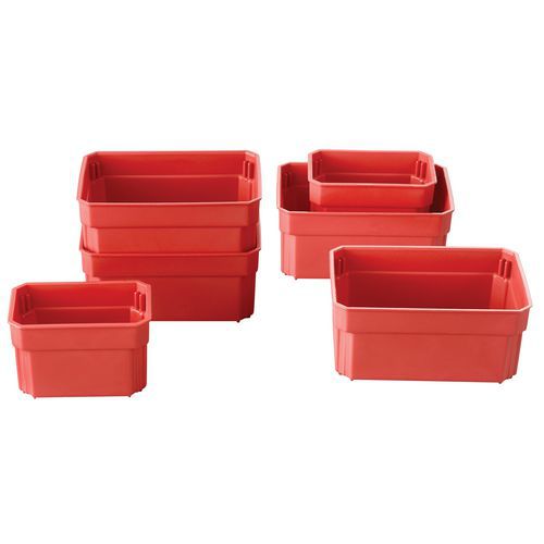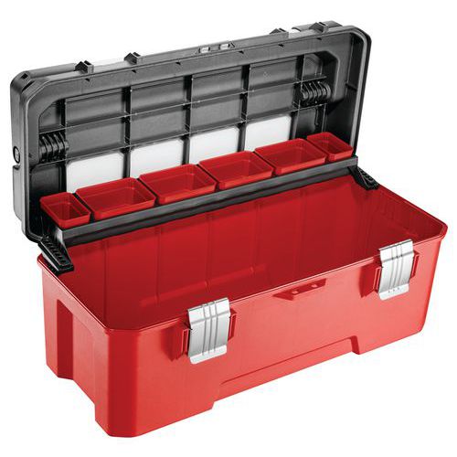 Műanyag szerszámos dobozok rekeszekkel és tálcákkal. 6 kivehető rekesz az apró alkatrészek tárolására. 2 bittartó a tálca mindkét oldalán. Nem áll fenn a csavarok kiszóródásának veszélye szállítás közben. Önkioldó tálca kivehető tálcákkal az apró alkatrészek tárolására . Tömítés IP54 védettségi fokozattal. Alumínium fogantyú. Korózióálló fém kapcsok. Max. terhelés (kg) : 13 kg