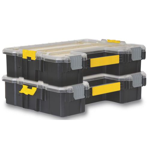 Kivehető rekeszek ideálisak kisebb tárgyak tárolására. Törhetetlen átlátszó tok fedele. A praktikus fogantyú kényelmes szállítást biztosít.