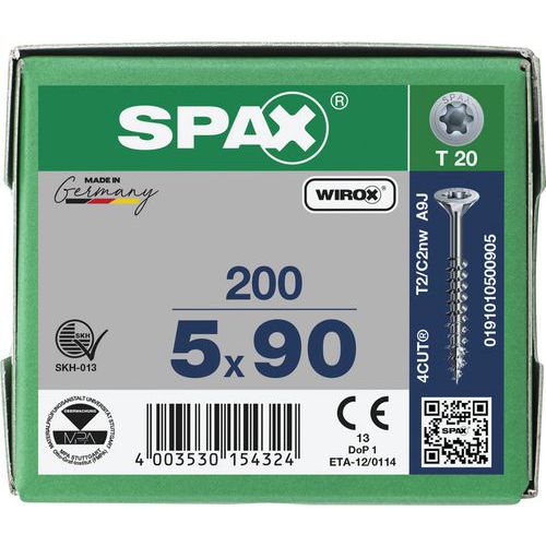 SPAX univerzális csavarok teljes menettel - süllyesztett fejjel, önmetsző hegyű. A kiváló minőségű, teljes menetű SPAX univerzális csavarok gyors, hatékony és tiszta munkához készültek fában, előfúrás nélkül. A fej és a hegy speciális kialakításának köszönhetően ideálisak faépítészethez, bútorszereléshez vagy belsőépítészethez. A sokszögű alsó résszel rendelkező süllyesztett fej meghúzáskor magától belevág az anyagba, így nincs szükség előfúrásra. A négyzet alakú profilú önmetsző hegy kinyomja a fa rostjait, pontos helyet biztosítva a csavartestnek. A teljes hosszban végigfutó menet szilárd és egyenletes csatlakozást biztosít. Korróziógátló kezelés a hosszabb élettartam és a nedves környezetben való használat érdekében.